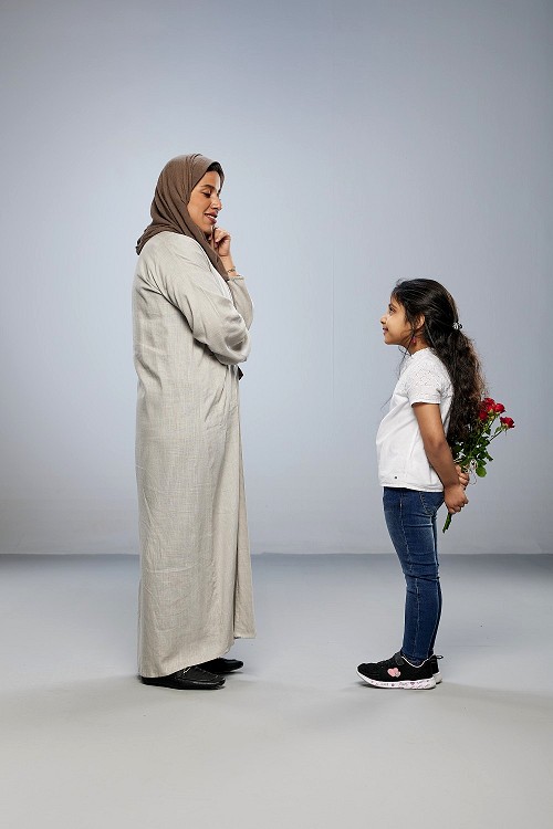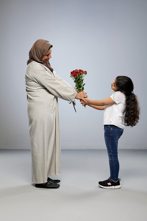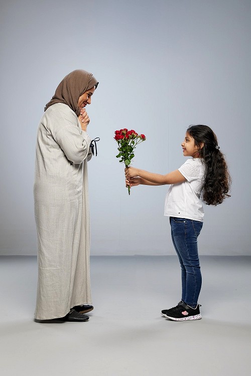 A girl standing giving flowers to her mother on gray background