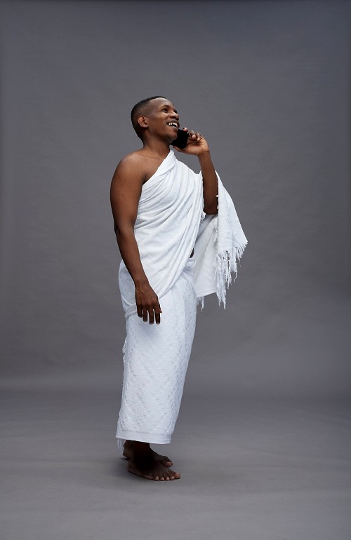 A man wearing Ehram Standing talking on phone on gray background