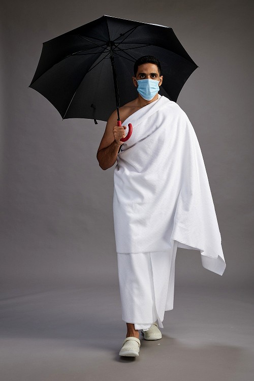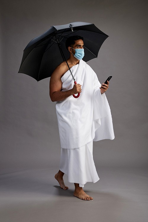 A man wearing Ehram and mask Standing holding umbrella on gray background on gray background