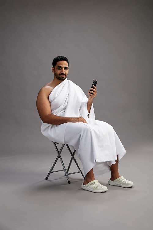 A man wearing Ehram sitting on chair texting on phone on gray background
