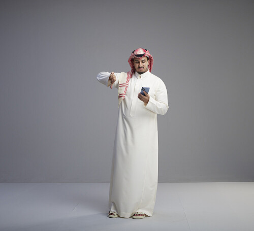 A Saudi man standing wearing thob and red shomag texting on phone on gray background