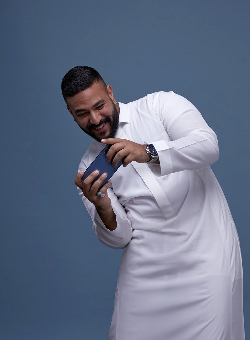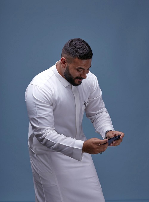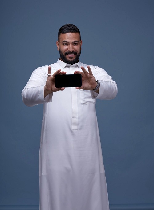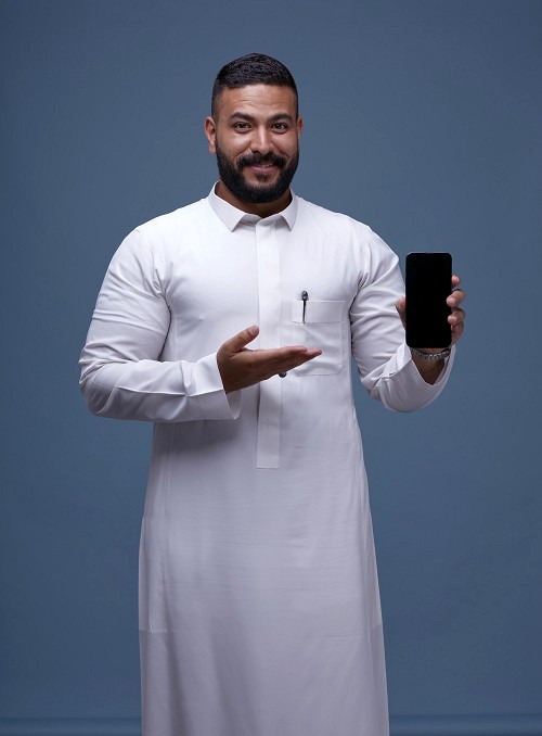 A man Showing his phone in Blue Background wearing Saudi Thob