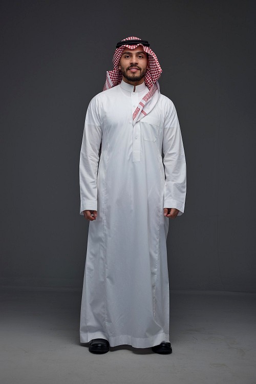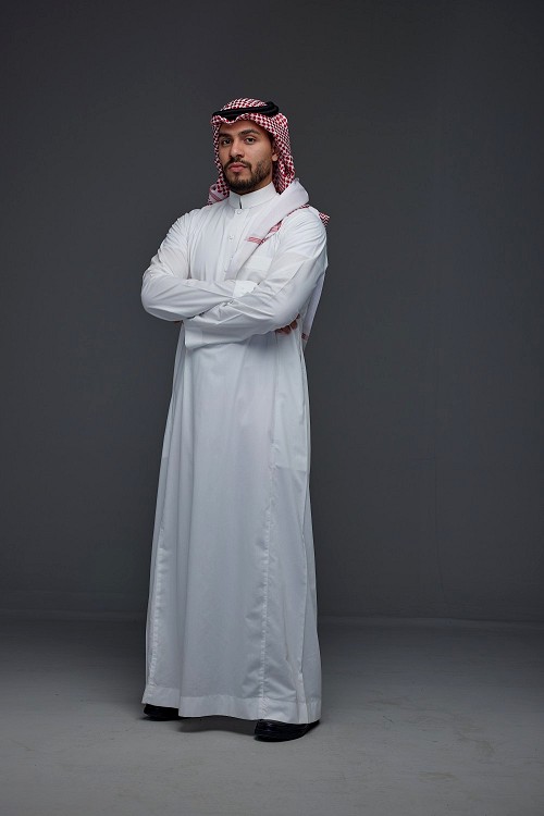 A Saudi man wearing Thobe and Shmagh standing in different poses eye level on a gray background