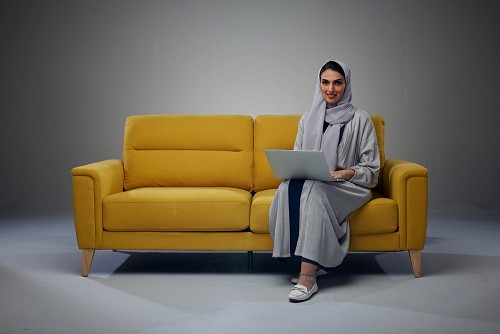 A Saudi woman wearing a light gray Abaya and head scarf sitting on a yellow sofa and using her laptop eye level on a grey background