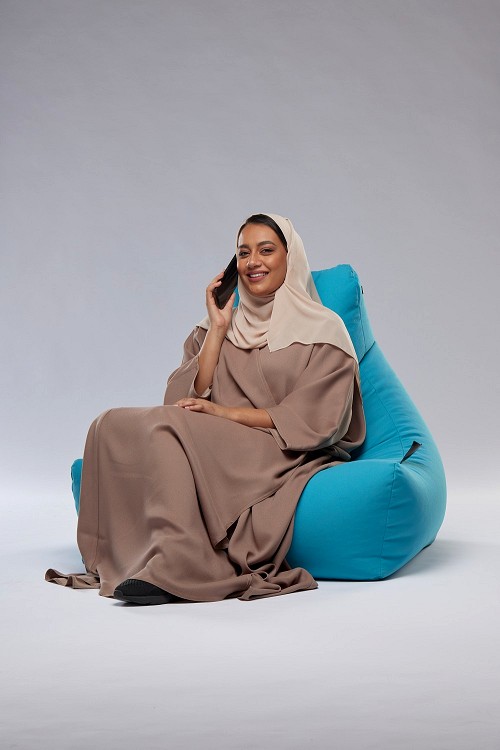 A Saudi woman sitting on a blue beanbag and working on laptop