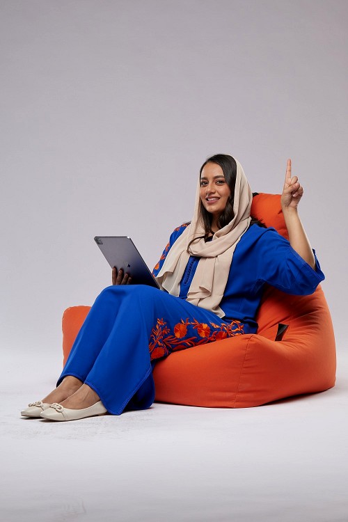 A Saudi woman sitting on an orange beanbag and working on tablet