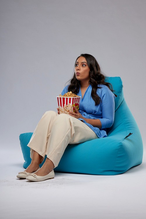 A woman sitting on a blue beanbag and eating popcorn