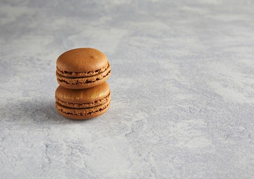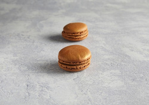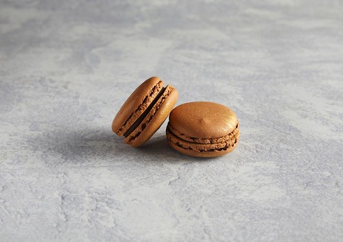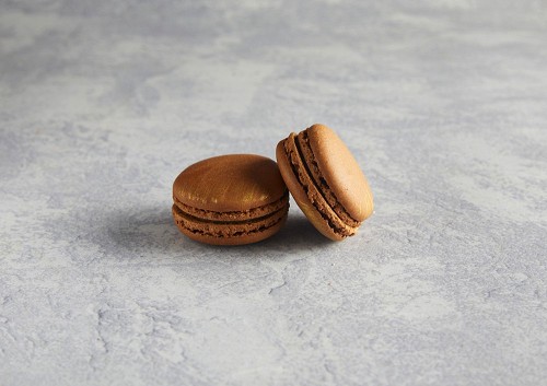45º Shot of two Brown Coffee macarons  on white  marble background