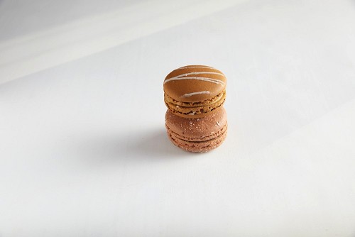 45º Shot of of two assorted Brown Irish Cream, and Brown Hazelnuts macarons on white background