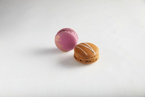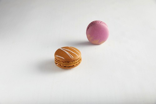 45º Shot of of two assorted Brown Irish Cream, and Purple Strawberry macarons on white background