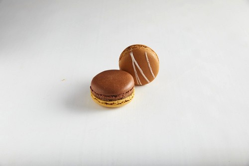 45º Shot of of two assorted Brown Irish Cream, and Yellow, and Brown Chai Latte macarons on white background