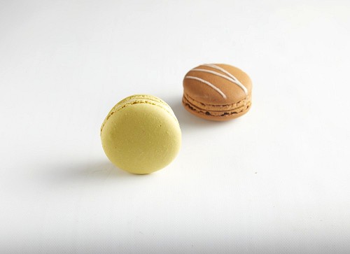 45º Shot of of two assorted Brown Irish Cream, and Yellow Lime macarons on white background