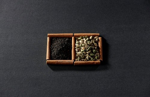 2 squares of cinnamon sticks full of cardamom and black tea on black flooring