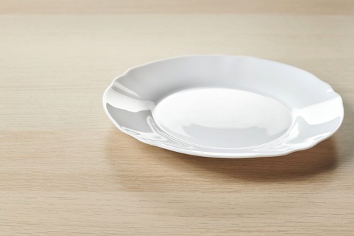 A white ceramic circular plate on light wooden background
