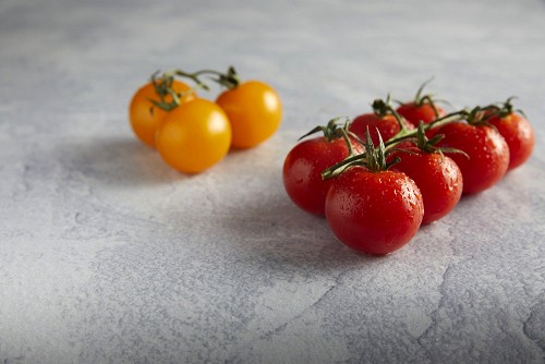 Mixed cherry tomato veins on a textured black slate background 45 degree