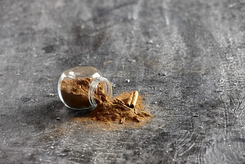 Flipped glass herbs jar full of cinnamon powder with cracked cinnamon sticks on a textured black background