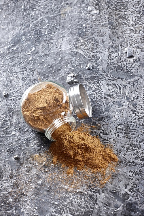 Flipped herbal glass jar full of cinnamon powder on textured black background