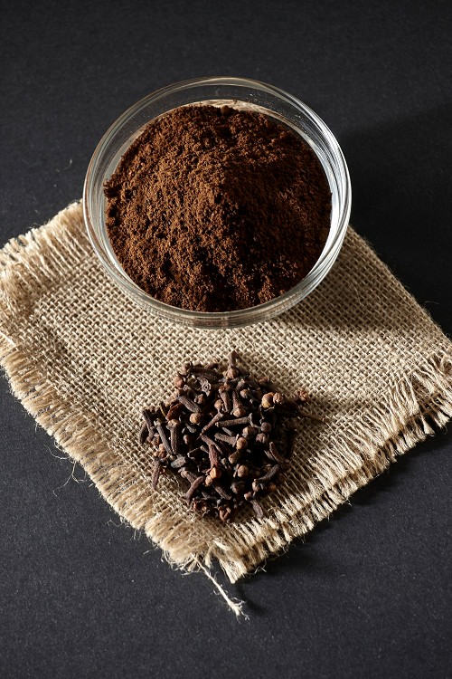 A glass bowl full of cloves powder with cloves grains on a burlap piece on a black flooring