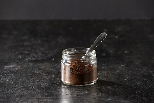 A glass jar full of cloves powder with a metal spoon on a textured black flooring