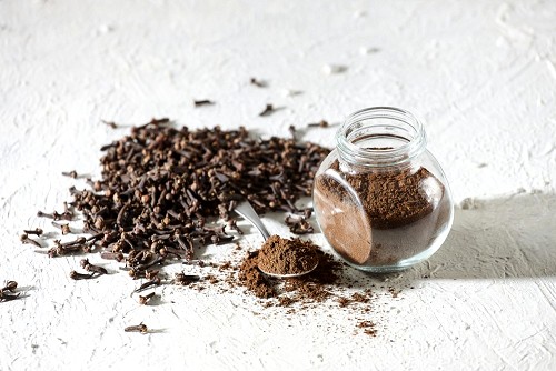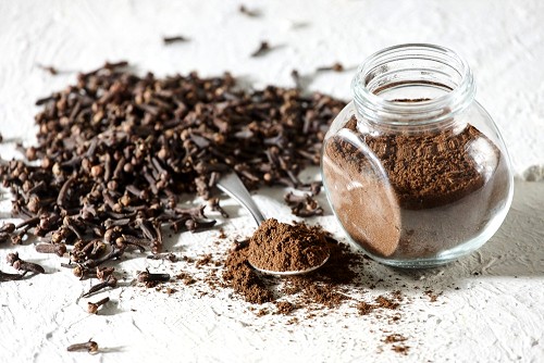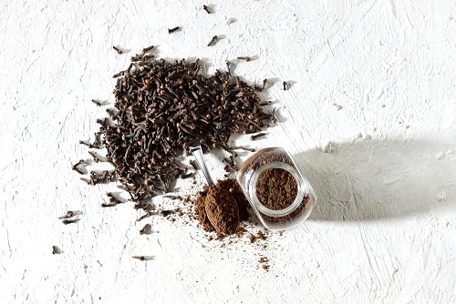A glass spice jar and a metal spoon full of cloves powder and cloves spread on textured white flooring