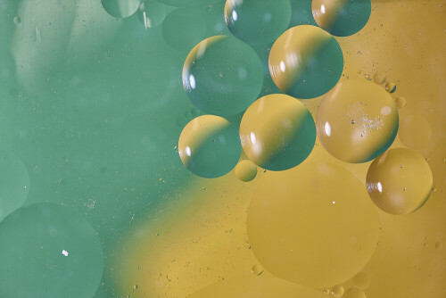 Close-ups of abstract oil bubbles on water surface in shades of green and yellow