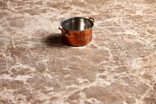 A small copper pot on beige marble background