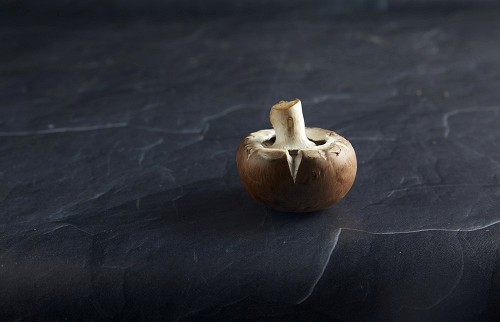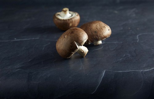 45 degre cremini mushrooms on a textured black slate background