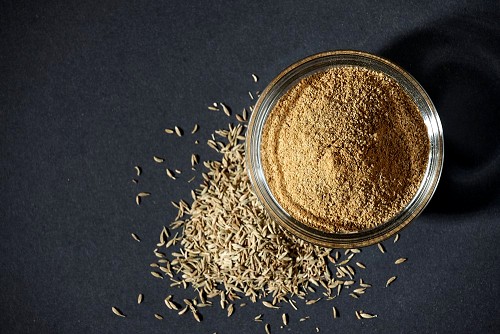 A glass bowl full of cumin powder with cumin seeds beside it on black flooring