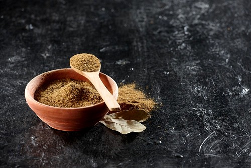 A wooden bowl and spoon full of cumin powder on a textured black flooring