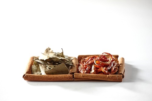 2 squares of cinnamon sticks full of dried red chilis and bay laurel leaves on white flooring