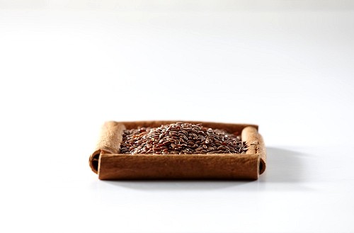 A single square of cinnamon sticks full of flaxseeds on white flooring