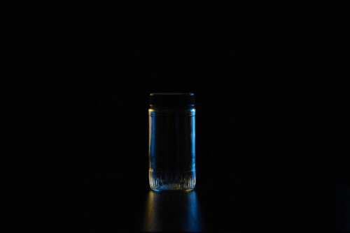 Glassware with rim light in blue and yellow against black background