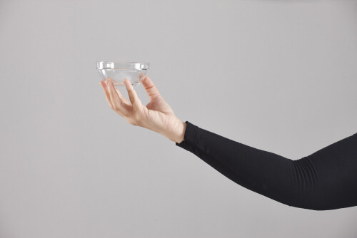 A woman in black abaya holding different glassware in different positions
