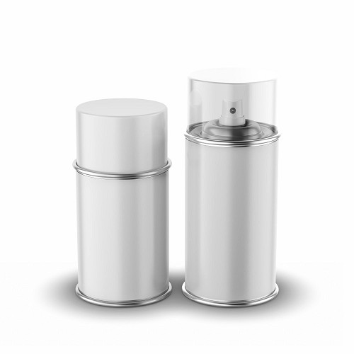 Metal spray bottle mockup with transparent cap and label isolated on white background 3d rendering