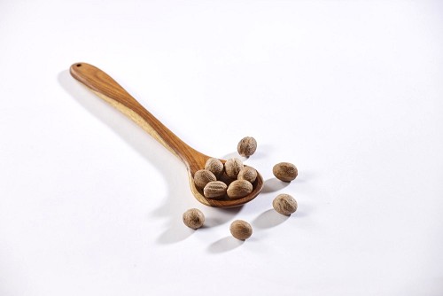 A wooden ladle full of whole nutmeg seeds on a white flooring