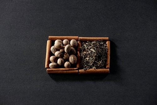 2 squares of cinnamon sticks full of nutmegs and dried basil on black flooring