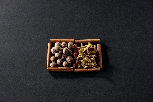 2 squares of cinnamon sticks full of nutmeg and turmeric fingers on black flooring