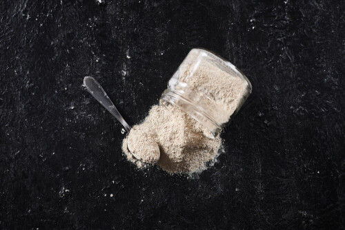 A glass jar full of onion powder flipped with some spilling powder on black background