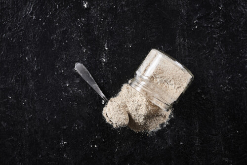 A glass jar full of onion powder flipped with some spilling powder on black background