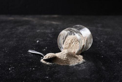 A glass jar full of onion powder flipped with some spilling powder on black background