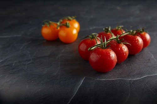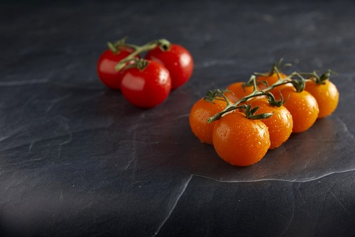 Orange cherry tomato vein on a textured black slate background 45 degree