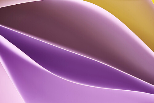 This image showcases an abstract paper art composition with paper curves in purple and gold gradients created by colored light