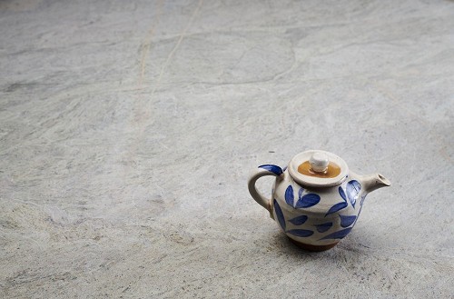 A pottery teapot on grey marble background