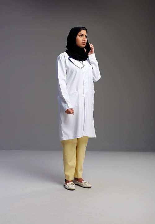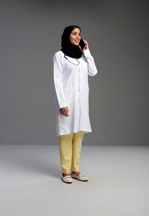 Saudi woman wearing lab coat with stethoscope standing talking on phone on Gray background