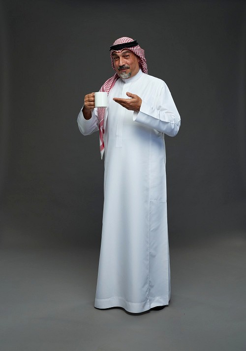 Saudi man with shomag Standing holding mug on gray background