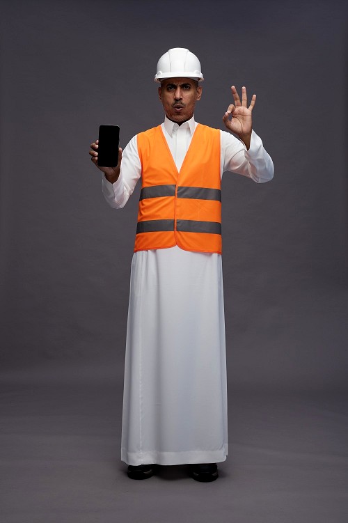 Saudi man wearing thob with engineer vest standing showing phone to camera on gray background