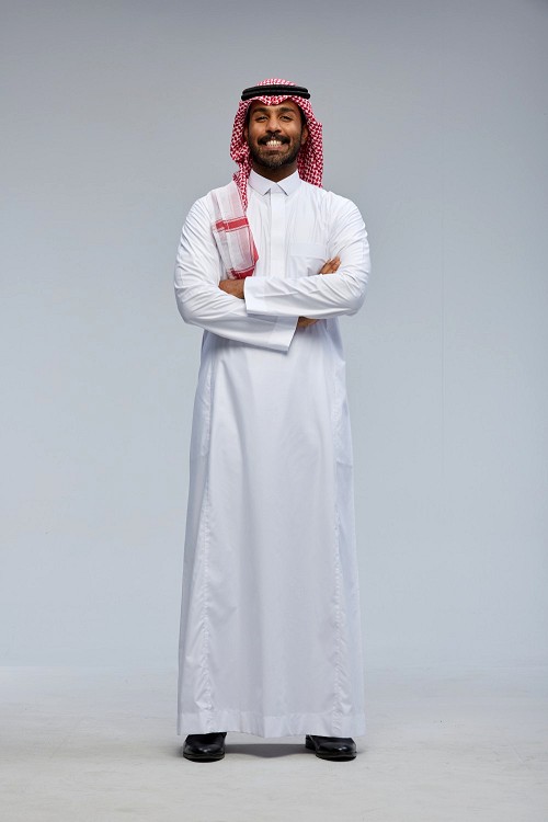 Saudi man Wearing Thob and shomag standing with crossed arms on Gray background