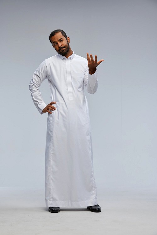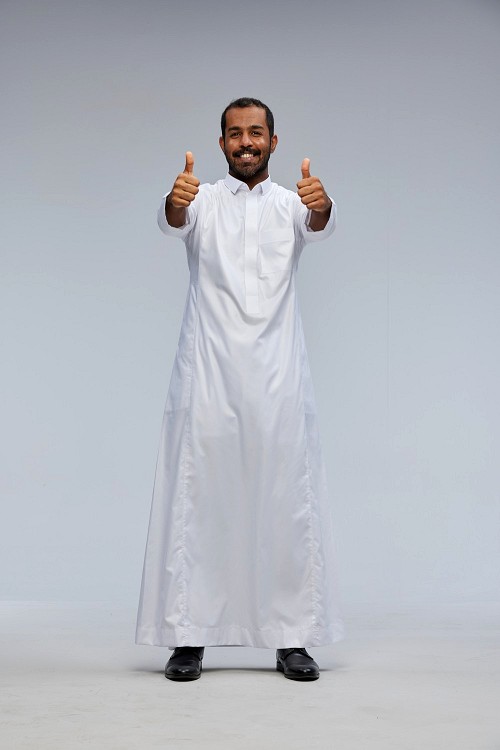 Saudi man Wearing Thob standing interacting with the camera on Gray background