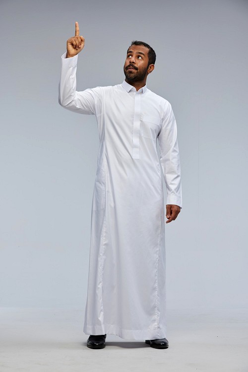 Saudi man Wearing Thob standing interacting with the camera on Gray background