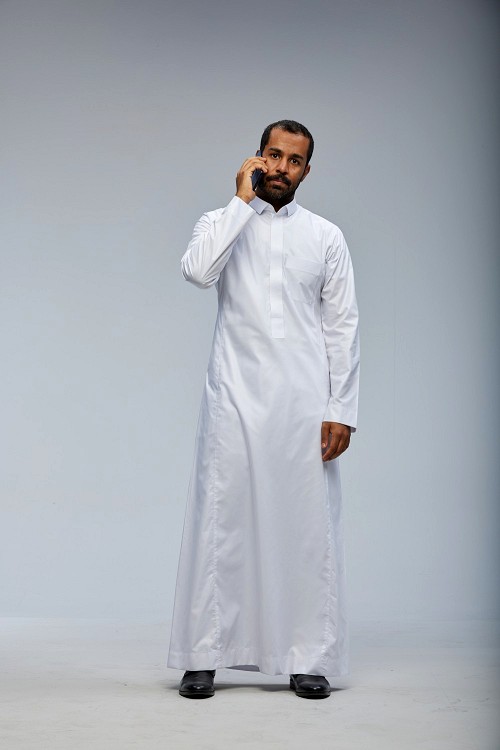 Saudi man wearing Thob standing talking on phone on Gray background